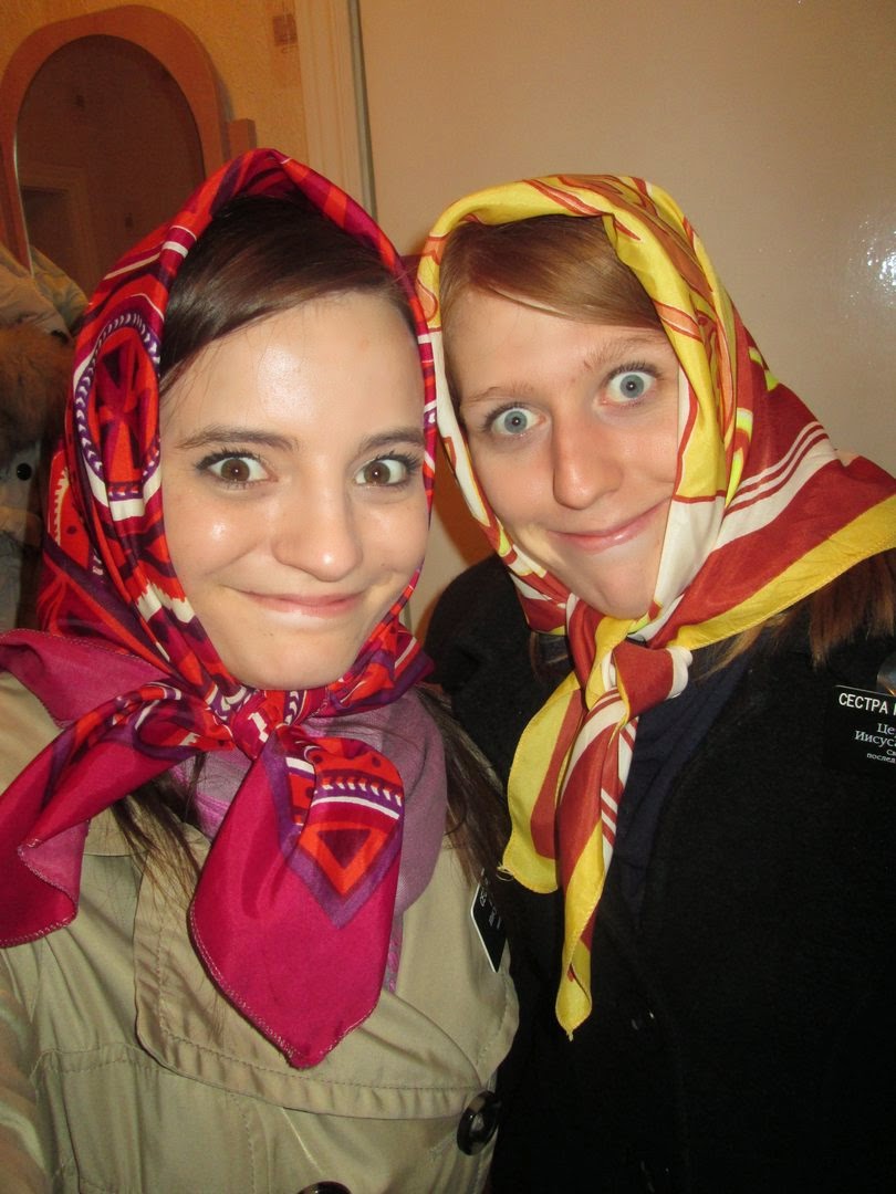 PS: The pics are just a sample of the awesomeness of last transfer -- Sister Parish and I with our babushka (old lady) scarves and me jamming on the guitar during English contacting.